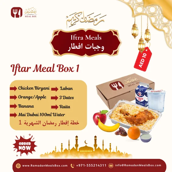 Iftar Meal Box 1 comes into place to make Ramadan easier, healthier, and more special. Every box will contain Chicken Biryani, laban, fresh fruits, dates, water, halwa, and raita, which you need to prepare a proper iftar.